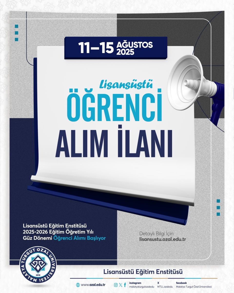 ► Malatya Turgut Özal Üniversitesi Lisansüstü Eğitim Enstitüsü 2025-2026 Eğitim Öğretim Yılı Güz Dönemi Öğrenci Alımı Detaylı Bilgi İçin Tıklayınız...