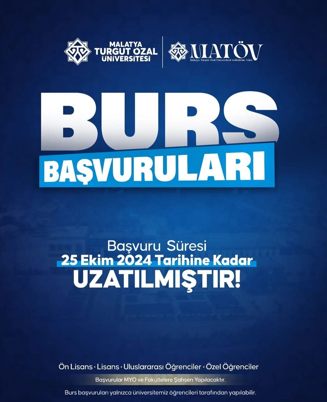 Malatya Turgut Özal Üniversitesi Geliştirme Vakfı Burs başvuru süresi 25 Ekim 2024 tarihine kadar uzatılmıştır.