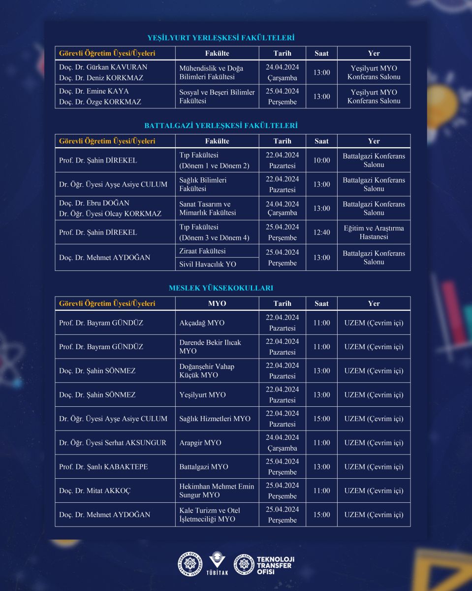 Informational events will be organized at our university on April 22-25, 2024, at the Battalgazi and Yeşilyurt campuses, and also online, under the scope of the "2209-A University Students Research Projects Support Program" carried out by the TÜBİTAK Science and Human Resources Support Programs Presidency (BİDEB). These events aim to cultivate project development culture and encourage associate and undergraduate students studying at our university to engage in project preparation and research activities. We look forward to the participation of all students and academic staff.