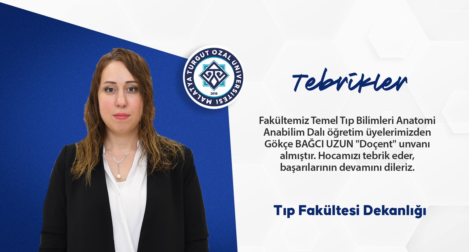 Fakültemiz Temel Tıp Bilimleri Anatomi Anabilim Dalı öğretim üyelerimizden Gökçe BAĞCI UZUN "Doçent" unvanı almıştır. Hocamızı tebrik eder, başarılarının devamını dilerim.