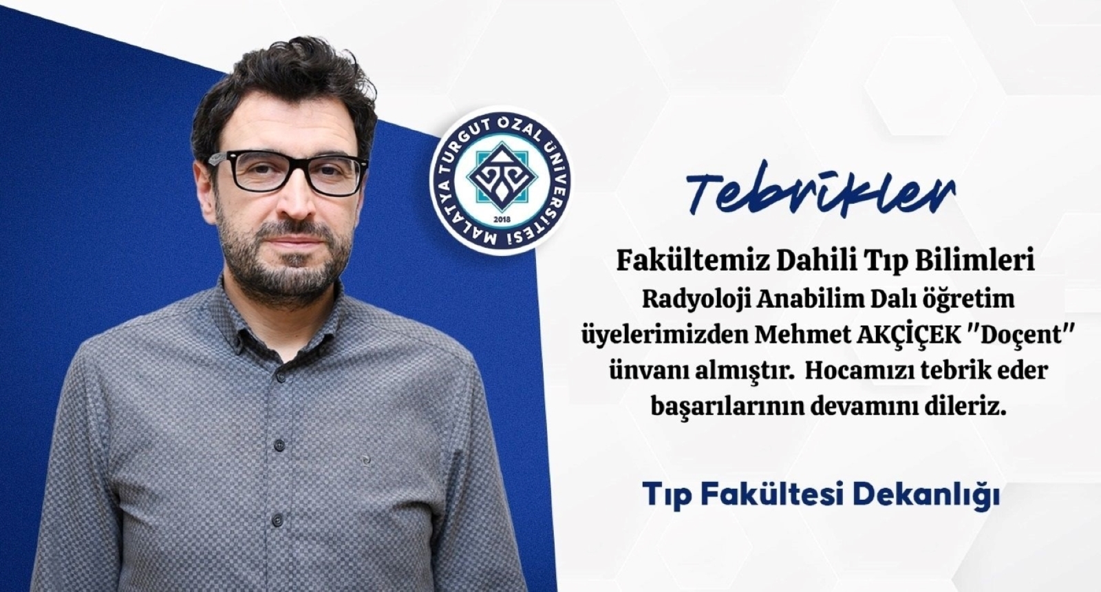 Fakültemiz Dahili Tıp Bilimleri Radyoloji Anabilim Dalı öğretim üyelerimizden Mehmet AKÇİÇEK "Doçent" ünvanı almıştır. Hocamızı tebrik başarılarının devamını dileriz.