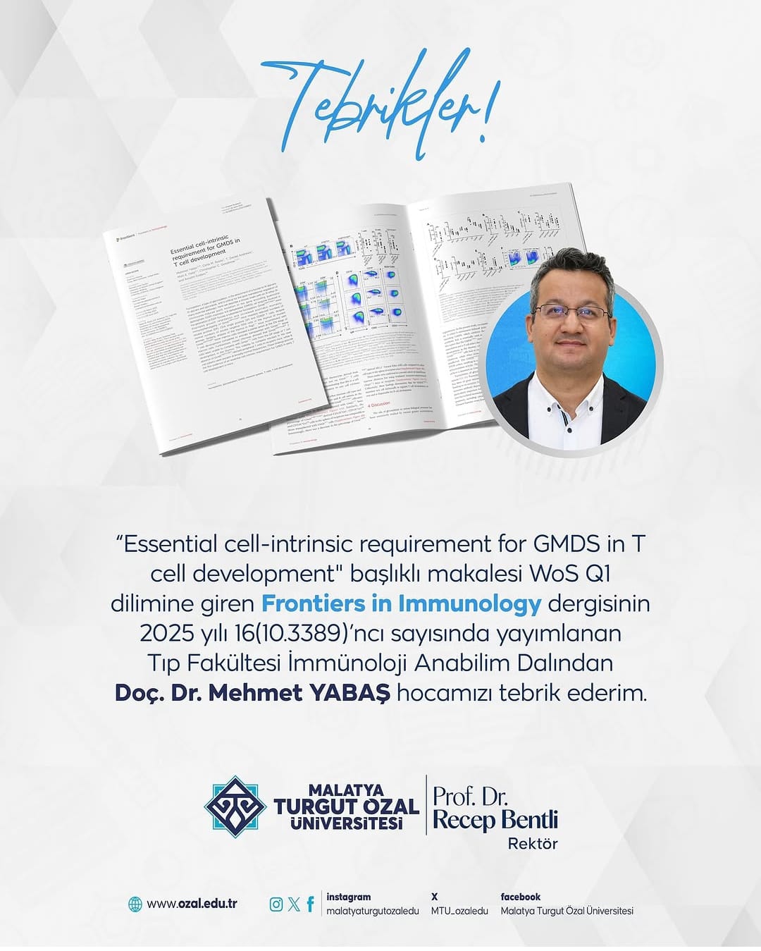 "Essential cell-intrinsic requirement for GMDS in T cell development" başlıklı makalesi WoS Q1 dilimine giren Frontiers in Immunology dergisinin 2025 yılı 16(10.3389)’ncı sayısında yayımlanan Tıp Fakültesi İmmünoloji Anabilim Dalından Doç. Dr. Mehmet YABAŞ hocamızı tebrik ederim.