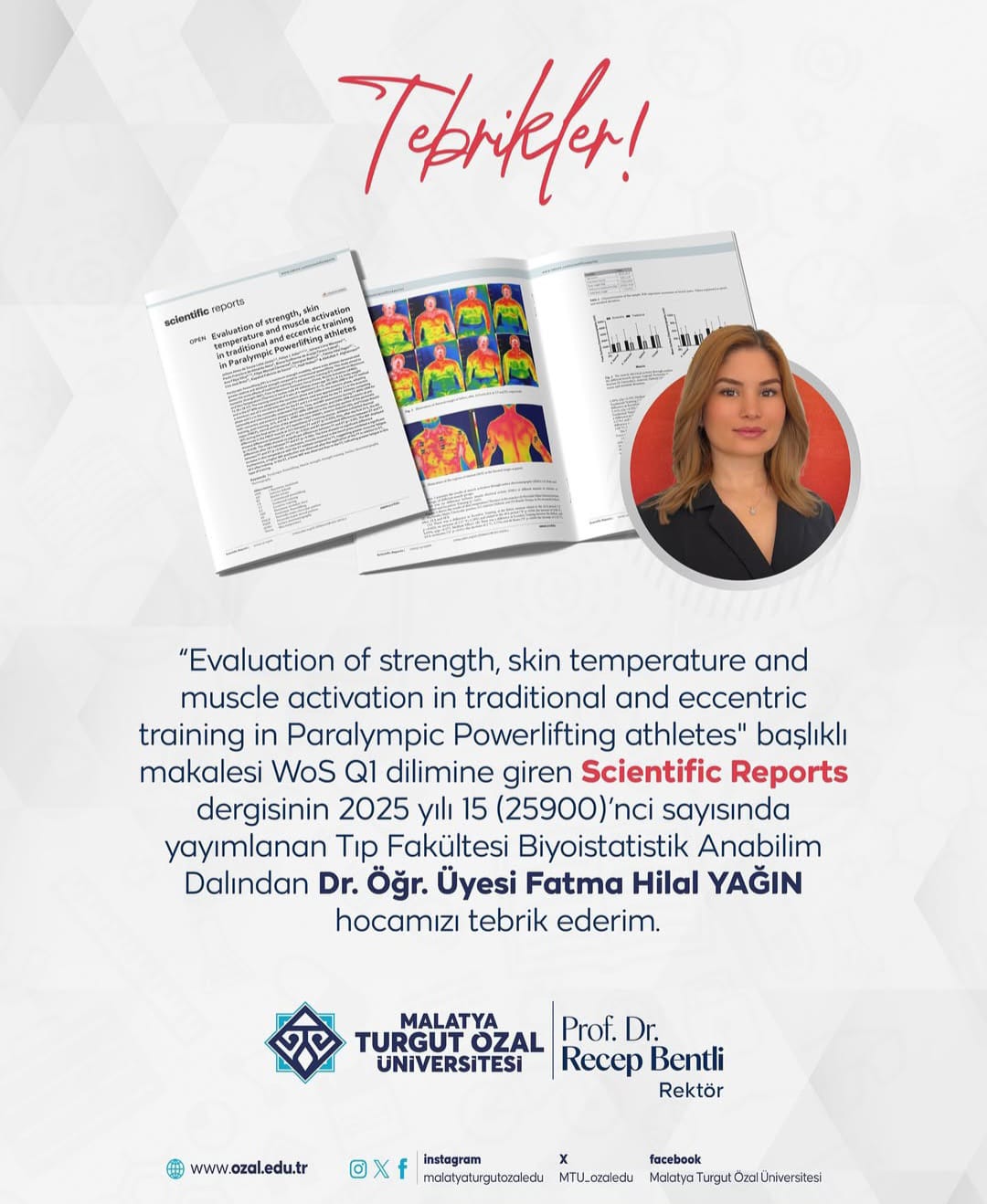 “Evaluation of strength, skin temperature and muscle activation in traditional and eccentric training in Paralympic Powerlifting athletes” başlıklı makalesi WoS Q1 dilimine giren Scientific Reports dergisinin 2025 yılı 15 (25900)’nci sayısında yayımlanan Tıp Fakültesi Biyoistatistik Anabilim Dalından Dr. Öğr. Üyesi Fatma Hilal YAĞIN hocamızı tebrik ederim.