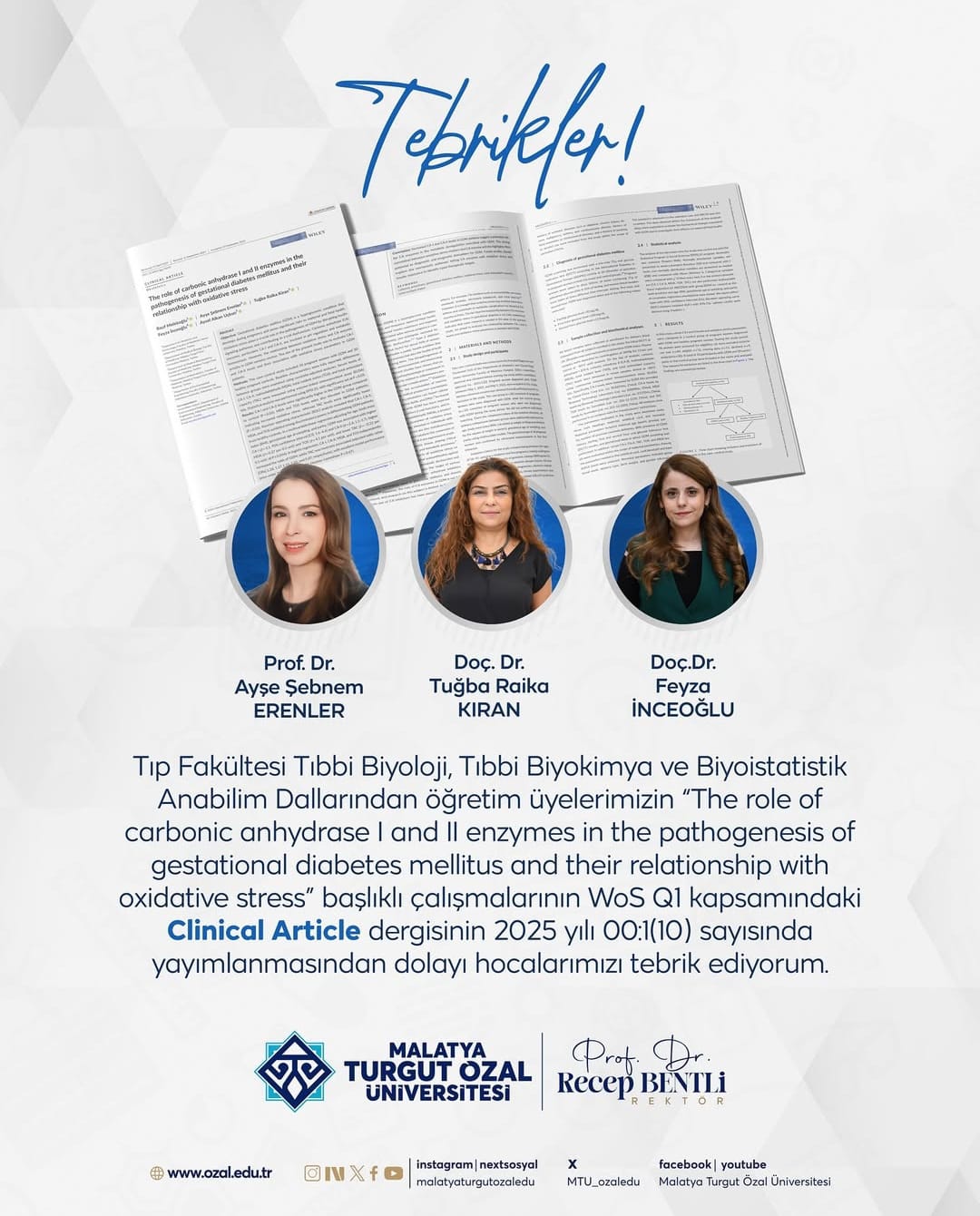 Tıp Fakültesi Tıbbi Biyoloji, Tıbbi Biyokimya ve Biyoistatistik Anabilim Dallarından öğretim üyelerimizin “The role of carbonic anhydrase I and II enzymes in the pathogenesis of gestational diabetes mellitus and their relationship with oxidative stress” başlıklı çalışmalarının WoS Q1 kapsamındaki Clinical Article dergisinin 2025 yılı 00:1(10) sayısında yayımlanmasından dolayı hocalarımızı tebrik ediyorum.