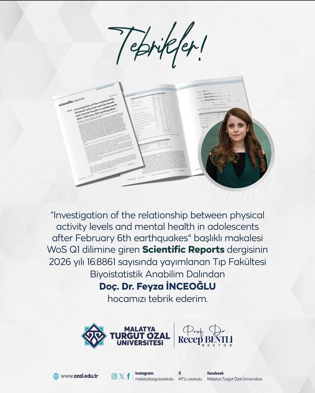 "Investigation of the relationship between physical activity levels and mental health in adolescents after February 6th earthquakes" başlıklı makalesi WoS Q1 dilimine giren Scientific Reports dergisinin 2026 yılı 16:8861 sayısında yayımlanan Tıp Fakültesi Biyoistatistik Anabilim Dalından Doç. Dr. Feyza İNCEOĞLU hocamızı tebrik ederim.